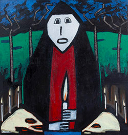 What I believe is important both for him and for us in these paintings is the feeling and sensation they convey, above all the sense of inwardness, or controlled passion as he prefers to put it, in which the candles, torches or flares that form such a key element in so many paintings here both illuminate the journey being taken and evoke a powerful sense not only of the sacred but, at times also, of rather darker forces. In the process he succeeds in creating a kind of counterpoint of light and dark, of the illuminated and still hidden and shadowy, that is close to the musical in its abstract effect.